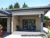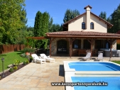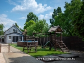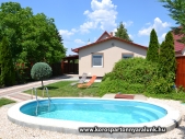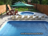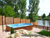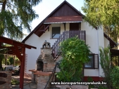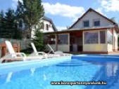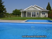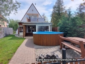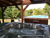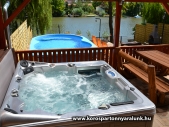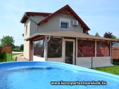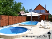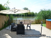 7+2 férőhelyes jacuzzis, finn szaunás, medencés, légkondicionált, hőszigetelt-téliesített, szépen parkosított nyaraló. Az emeletes épület földszintjén 2 szoba, nappali amerikai konyhával, 2 fürdőszoba wc-vel mosdóval, közlekedőből nyíló finn szauna található. A vízpart felé egy fedett, körben üvegponyvázott terasz, felszerelt nyári konyhával áll vendégeink rendelkezésére. Az emeleti részben, a lépcsőfeljáróval egy légtérben 2 heverő, és egy két ágyas szoba helyezkedik el. A fedett terasz alá helyeztük el, a 6 személyes, télen is üzemelő Canadai Coast- Spas jacuzzit. 10 méter széles kiépített part, stéggel, csónakkal, bográcsozóval, grillezővel. Udvaron rönkfajátszótér csúszdával, mászókával, hintával. A medence 4x3 méteres, ipari vízforgató berendezéssel ellátott. A vízpart a gyerekek védelme érdekében kerítéssel zárható. 4 személyautó parkolására alkalmas parkoló, melyből kettő fedett beálló. Szabad wifi.