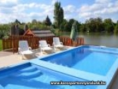 7+2 férőhelyes, föld feletti medencés, jacuzzis, légkondicionált, hőszigetelt faház, parkosított zárt udvarral. A nyaraló Szarvason, a Nagyfoki üdülősoron, a Nagyfoki holtág közvetlen vízpartján található. Az emeletes épület földszintjén tágas nappali, felszerelt amerikai konyha, sarokkádas fürdőszoba, fedett terasz 5 személyes Wellis jacuzzival. Az emeleti részhez kényelmes lépcsőfeljáró vezet. Az emeleti közlekedőből három szoba és egy fedett, vízpart felé néző erkély nyílik. 14 méter széles, kiépített part stéggel, csónakkal, vízibiciklivel, bográcsozóval, gázgrillel, fedett rönkfa pagodával. A vízpart a gyerekek védelme érdekében kerítéssel zárt. Udvaron rönkfajátszótér csúszdával, mászókával, hintával, trambulinnal, homokozóval felszerelve. A medence 5x3 méteres, ipari vízforgató berendezéssel ellátott. Az utca felől 4 személyautó parkolására alkalmas zárt parkoló. Szabad Wifi.