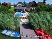 10+2 férőhelyes jacuzzis, föld feletti medencés, gyerekmedencés, Finn szaunás, minden helységében légkondicionált, hőszigetelt-téliesített, parkosított, közvetlen vízparti nyaraló. Az emeletes épület földszintjén nappali, felszerelt amerikai konyha, nappaliból nyíló szoba fürdőszobával wc-vel, egy külön fürdőszoba, fedett, körben üvegponyvázott terasz tartozik. Az emeleti részhez kényelmes lépcsőfeljáró vezet. Az emeleti közlekedőből két szoba nyílik, mindkettőhöz tartozik saját fürdőszoba zuhanyzóval WC-vel. A teraszon helyezkedik el az 4 személyes, télen is üzemelő jacuzzi és a teraszról nyílik a 4 személyes Finn szauna. 12 méter széles kiépített part stéggel, csónakkal, vízibiciklivel, bográcsozóval. Udvaron rönkfajátszótér csúszdával, mászókával, hintával. A medence 5x3 méteres, ipari vízforgató berendezéssel ellátott. Az utca felől 5 személyautó parkolására alkalmas zárt parkoló. Szabad Wifi.