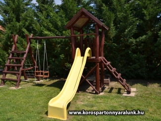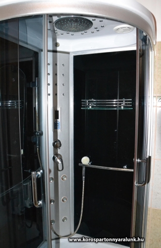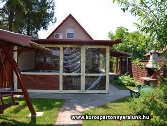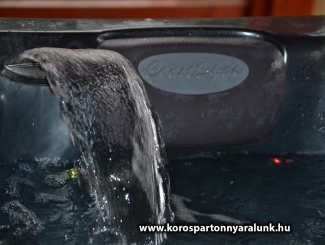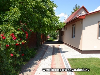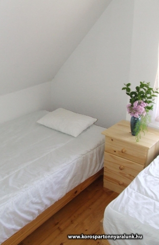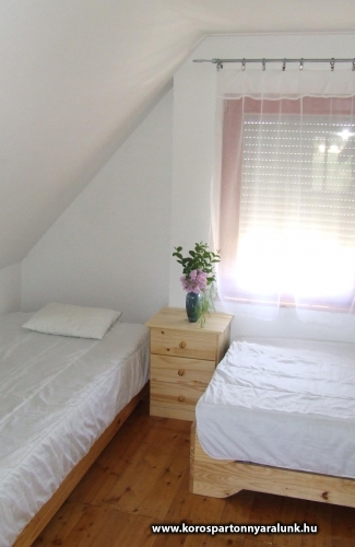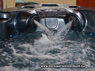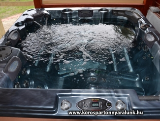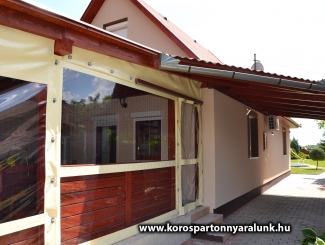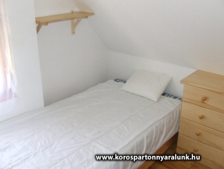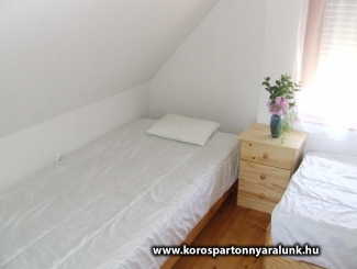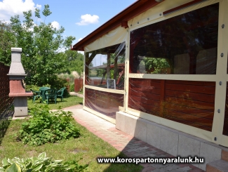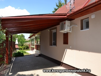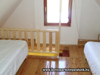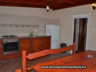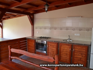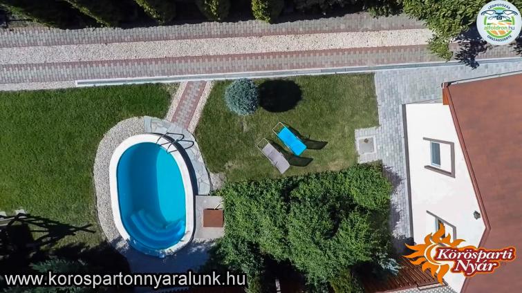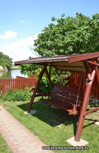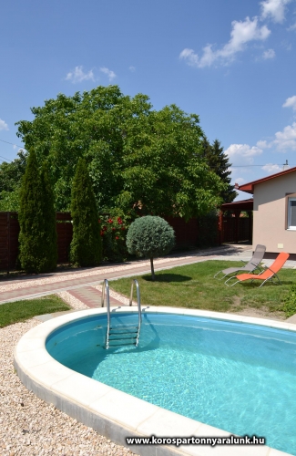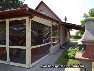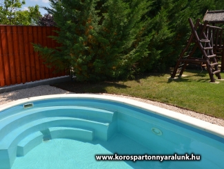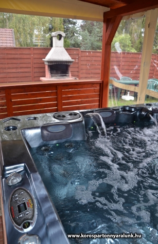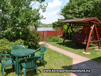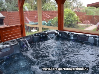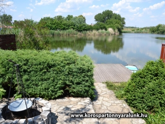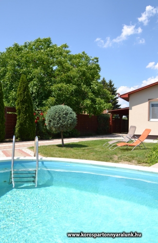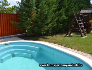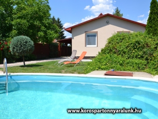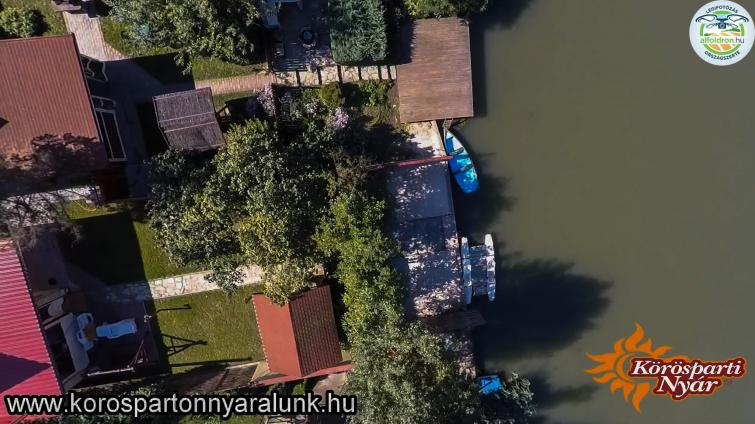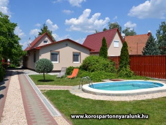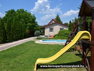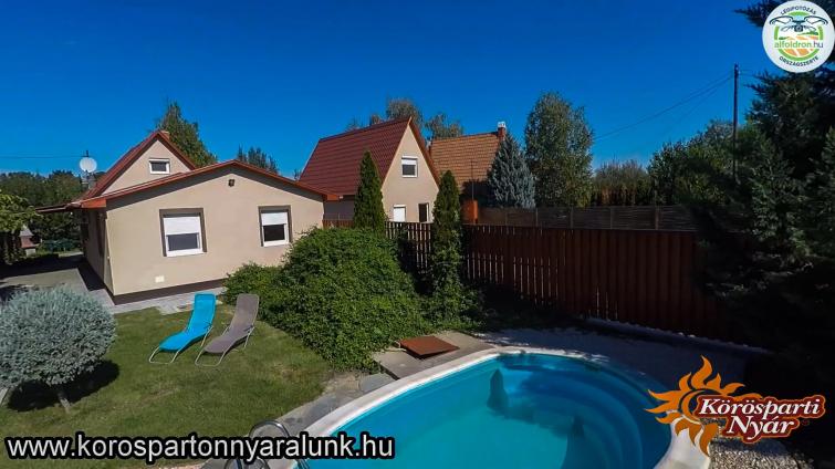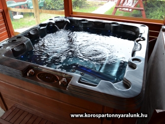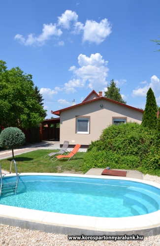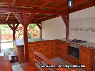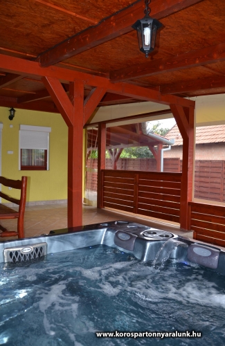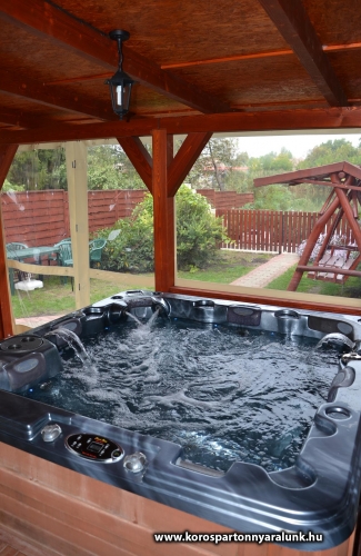 7+2 férőhelyes jacuzzis, finn szaunás, medencés, légkondicionált, hőszigetelt-téliesített, szépen parkosított nyaraló. Az emeletes épület földszintjén 2 szoba, nappali amerikai konyhával, 2 fürdőszoba wc-vel mosdóval, közlekedőből nyíló finn szauna található. A vízpart felé egy fedett, körben üvegponyvázott terasz, felszerelt nyári konyhával áll vendégeink rendelkezésére. Az emeleti részben, a lépcsőfeljáróval egy légtérben 2 heverő, és egy két ágyas szoba helyezkedik el. A fedett terasz alá helyeztük el, a 6 személyes, télen is üzemelő Canadai Coast- Spas jacuzzit. 10 méter széles kiépített part, stéggel, csónakkal, bográcsozóval, grillezővel. Udvaron rönkfajátszótér csúszdával, mászókával, hintával. A medence 4x3 méteres, ipari vízforgató berendezéssel ellátott. A vízpart a gyerekek védelme érdekében kerítéssel zárható. 4 személyautó parkolására alkalmas parkoló, melyből kettő fedett beálló. Szabad wifi.