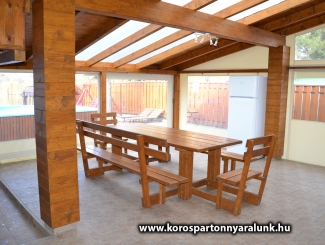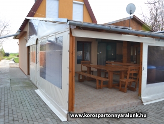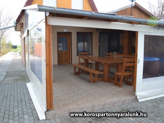 Körben üvegponyvázott, tolóajtókkal ellátott fedett terasz.