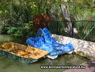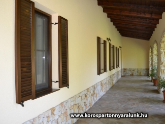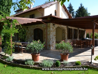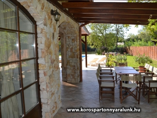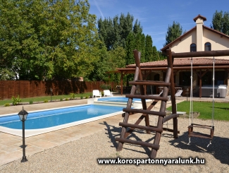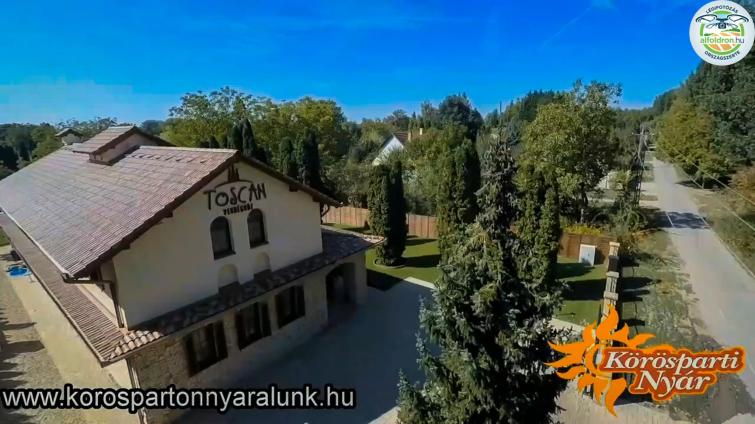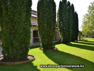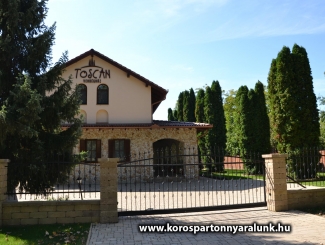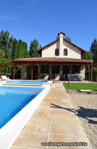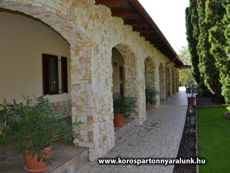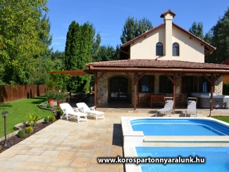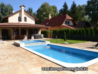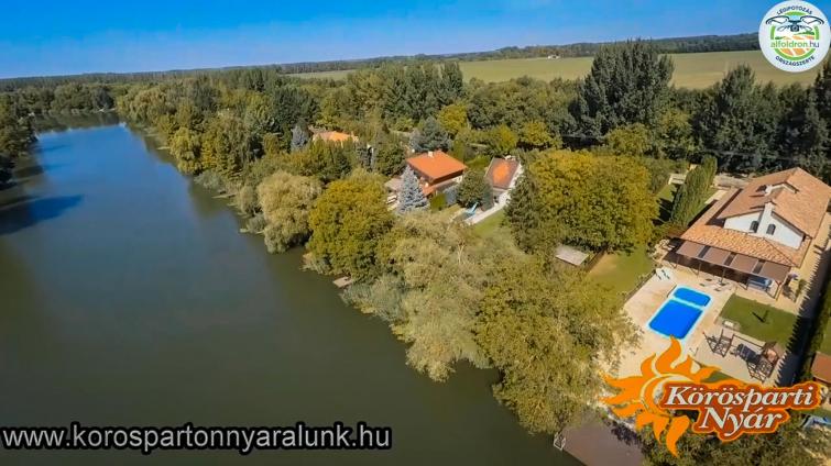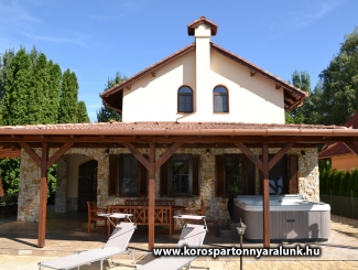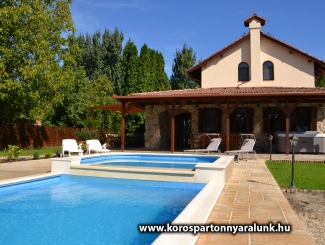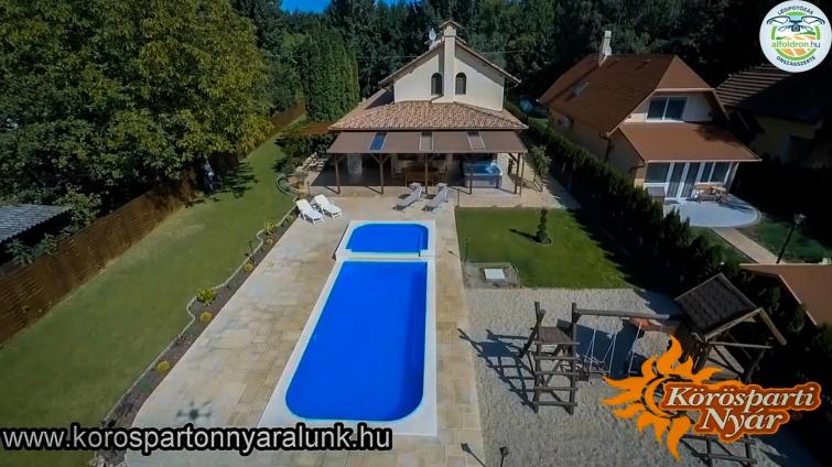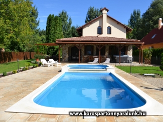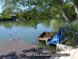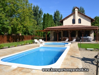 16 + pótágyazható emeletes, légkondicionált, minden igényt kielégítően berendezett, felszerelt tágas, új építésű Toscan stílusú nyaraló. 1600 m2-es telken, 18 méter széles vízparttal. Az épületben 5 db különálló szoba, 5 db fürdőszoba WC-vel, tágas nappali amerikai konyhával, fedett 50 négyzetméteres terasz. A nyaraló mozgássérültek, kerekesszékes vendégek fogadására is alkalmas. Központi fűtéses hőszivattyús, illetve vízteres kandallóval fűthető, hőszigetelt, téliesített. A zárt udvaron hőszivattyúval fűthető két medence, hat személyes jacuzzi, finn szauna, rönkfajátszótér, pingpongasztal, bográcsozó  található. A kiépített vízparton nagy méretű stég, napozó terasz, csónak, vízibicikli, parti világítás. Szabad Wifi.