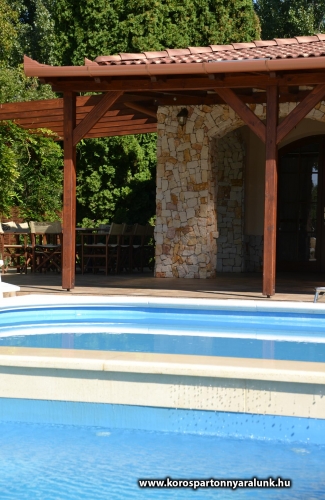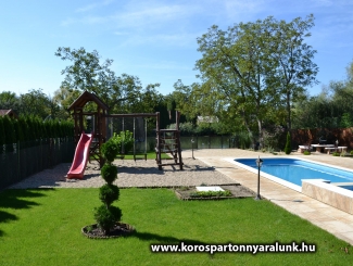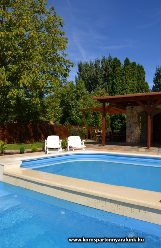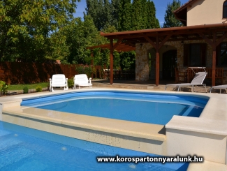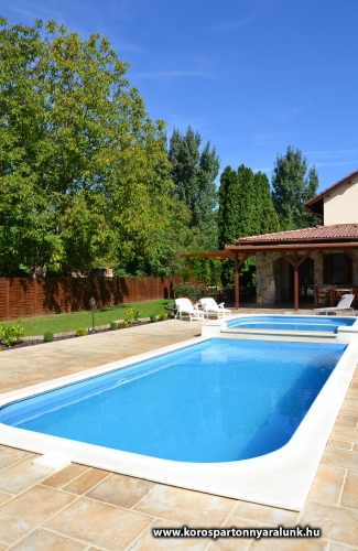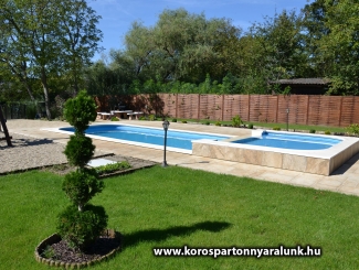 • 5x3 méteres nagy medence 120 cm-es vízmélységgel, 2.5x3 méteres gyerekmedence 50 cm-es vízmélységgel. A medencék ipari homokszűrős víztisztító berendezéssel vannak felszerelve. Medencék körül napozóterasz, napozóágyak, napernyők, kerti tusoló és rönkfa ülőgarnitúra található.
