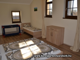 • Utca felé néző emeleti szoba: három heverővel és egy kinyitható ülőgarnitúrával, fürdőszobával.